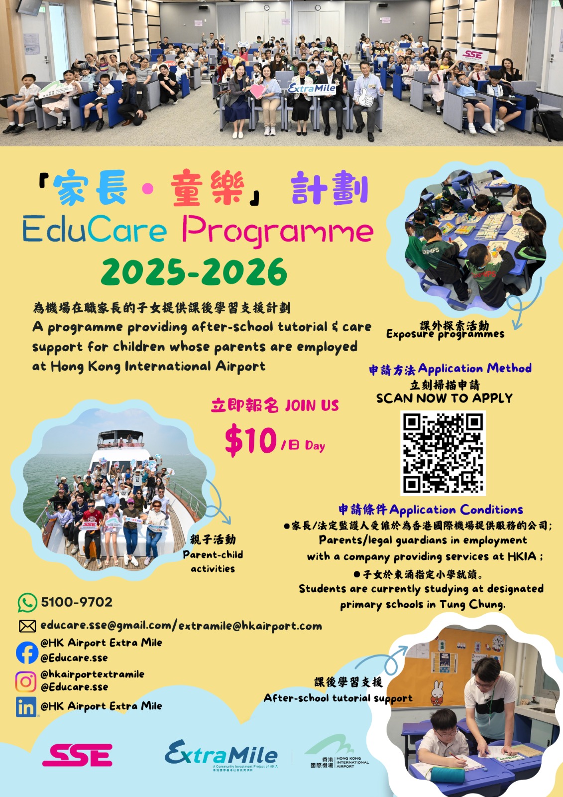 「家長・童樂」是為期一學年的課後學習指導計劃,特別為父母在香港國際機場工作的東涌小學生而設,內容涵蓋學習支援、體驗計劃及家庭支援。